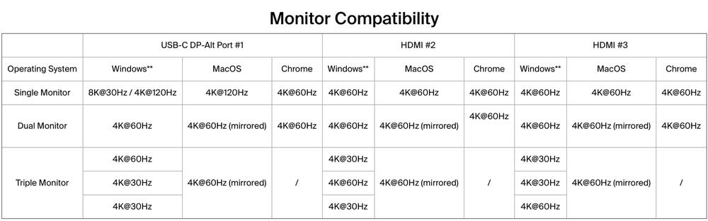 - Supports up to 3 external monitors: Single display up to 8K@30Hz, dual display up to 4K@120Hz, triple display up to 4K@60Hz